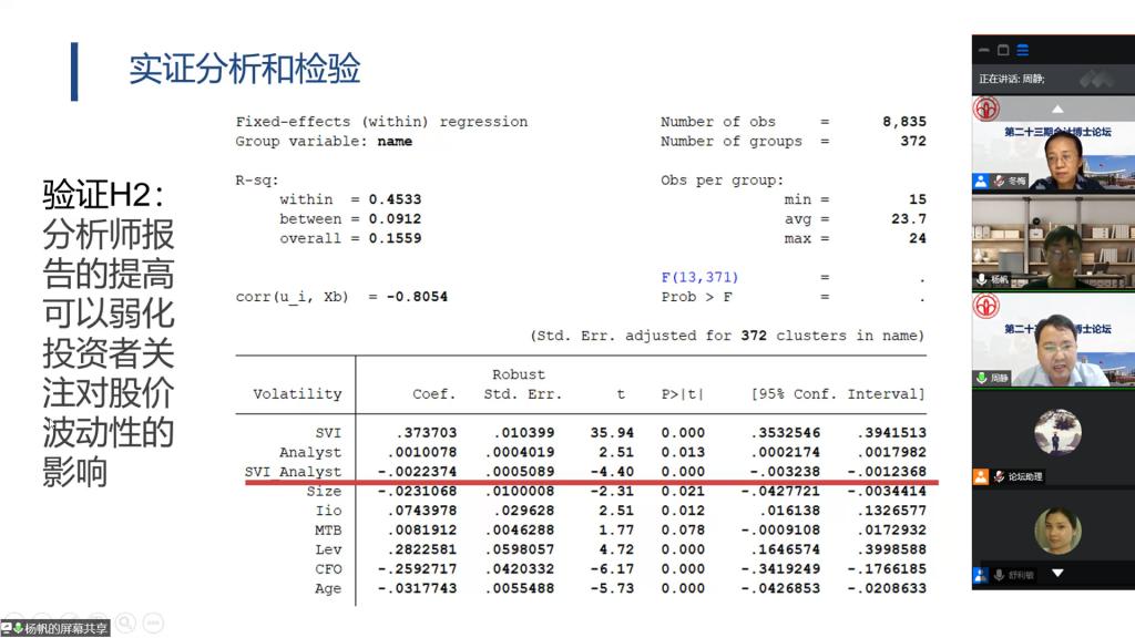 杨帆同学报告的论文题目是《投资者关注、分析师报告和股价波动性》,该文研究了投资者关注与分析师报告对股价波动性的影响。周静老师对论文进行了系统点评,陈晖丽博士、陈泽艺博士、高传伦博士、吴兰博士等老师建议作者进一步梳理研究假设之间的逻辑关系、注意投资者关注与股价波动性关系中本地投资者关注与异地投资者关注的组间差异对比,优化理论部分的结构,注意相关结论措辞避免太过武断等。