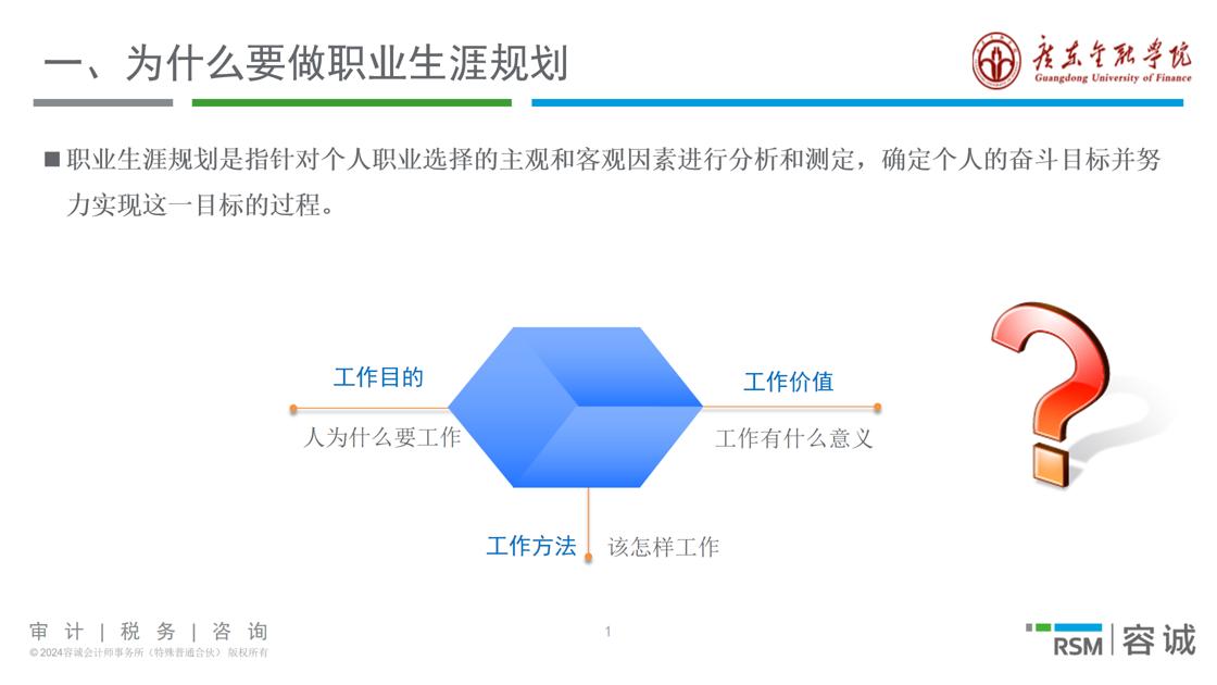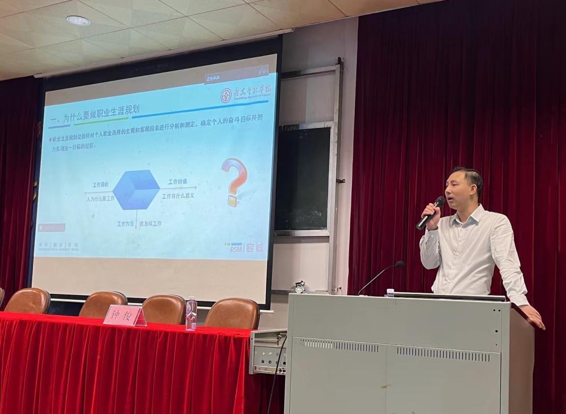 首先,钟先生提出“为什么要做职业生涯规划?”这一问题,不仅引发了同学们的思考,并且活跃了讲座的气氛,接着明确指出职业生涯规划的概念,即针对个人职业选择的主观和客观因素进行分析和测定,确定个人的奋斗目标并努力实现这一目标的过程。
