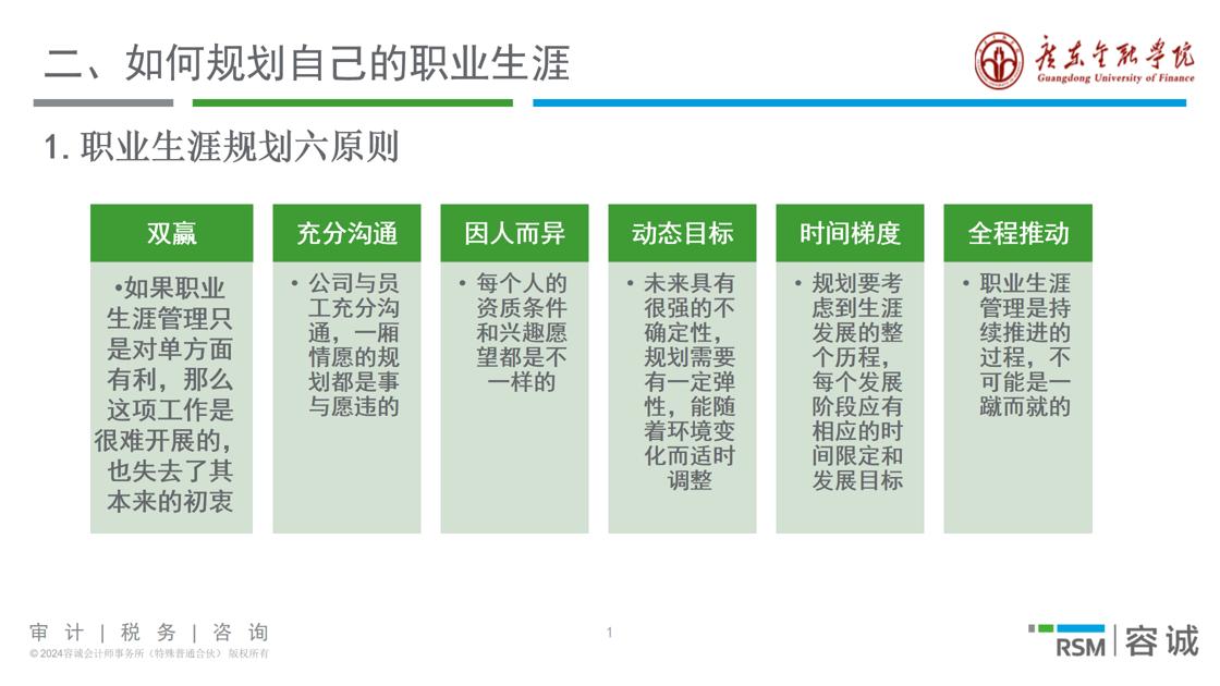 接下来,钟先生指出职业生涯规划的六大原则:双赢、充分沟通、因人而异、动态目标、时间梯度、全程推动。他向同学们强调了目标设定的核心作用,帮助同学们从自己的目标取向、能力取向和机会取向三个维度来思考问题。一句“没目标的人生叫流浪, 有目标的人生叫航行!”的殷切忠告,给予同学们深刻的启发,振奋人心。除外,他还通过数据和图表的形式向同学们展示了会计人的四大职业规划方向、注册会计师行业前景和近几年老员工毕业人数和失业率,并结合个人经历为同学们指点迷津。