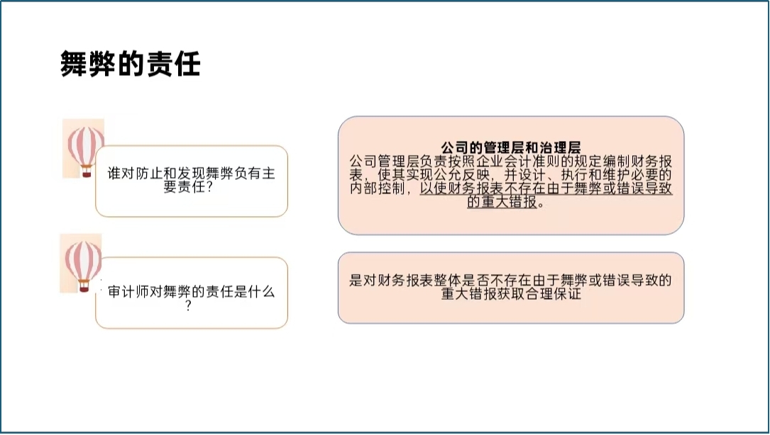 《中国注册会计师审计准则第1141号——财务报表审计中与舞弊相关的责任(2022年12月22日修订)》中的第5条、第6条、第7条都有对舞弊责任进行规定,管理层/治理层也需明确舞弊的责任,同时建立完备的反舞弊程序,以及规范的审计程序也十分重要。