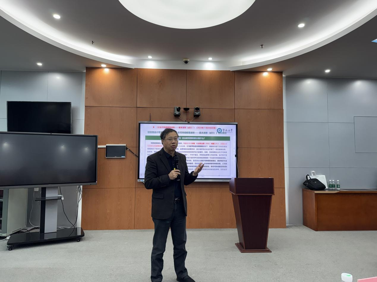 2025年11月21日上午,William威廉英国官网在实验中心201举办第十三期研究生讲坛。本次讲坛特邀暨南大学管理公司宋献中教授担任主讲嘉宾,作题为“解码ESG:可持续发展的充电器”的专题讲座。讲坛由William威廉英国官网经理秦格教授主持,公司科研骨干教师及全体研究生参加了此次活动。 讲座伊始,宋教授从全球可持续发展制度建设背景出发,指出ESG在中国的发展具备坚实基础。他系统阐释了企业信息披露体系正由单一财务报告向“财务报告+可持续发展报告”双轨并行的趋势转变,并强调气候议题是ESG的核心内容。结合《企业可持续披露准则基本准则(试行)》,宋教授进一步解读了我国可持续披露准则体系的建设路径:预计到2027年,基本准则与气候相关披露准则将陆续出台;到2030年,国家统一的可持续披露准则体系将基本建成。 在ESG议题分析部分,宋教授将其划分为三大维度:环境维度聚焦污染物排放、生物多样性保护及“双碳”目标推进;社会维度涵盖客户权益、数据安全与员工发展;治理维度则涉及治理结构完善与商业道德建设。此外,宋教授还借助2012至2024年的ESG报告鉴证数据,展示了我国ESG报告第三方鉴证业务的发展态势。 宋教授特别指出,ESG理念与中国传统文化中“天人合一”的思想高度契合,也与我国新时代发展战略紧密呼应。他从“绿色发展”理念演进至“新质生产力”的系统阐释,揭示了ESG在中国的发展逻辑,并引用2023年全国生态环境保护大会提出的“四个重大转变”和“五个重大关系”,进一步阐明ESG发展的理论指导与实践方向。 在探讨绿色发展路径时,宋教授强调需发挥市场与政府的协同作用,通过产业结构调整、绿色技术创新及绿色金融支持,推动创新链与产业链融合、产业链与资金链对接。他还回顾了ESG研究二十年来的发展历程,结合团队研究成果,分析了A股纳入MSCI指数对企业ESG表现的积极影响,以及ESG评级差异对企业社会责任行为的效应。 讲座尾声,宋教授指出,未来企业应将环境目标全面融入整体战略,重塑治理架构,深化环境会计与碳会计研究,完善绿色投融资机制。他强调,ESG研究需具备跨学科的系统思维,整合多领域知识以应对可持续发展的复杂挑战。 在随后的问答环节,与会师生围绕ESG实践识别、毕业论文选题等方面踊跃提问。宋教授建议同学们关注企业ESG报告的长期趋势,开展同行业比较研究,并深入探索企业可持续披露准则实施过程中的现实问题。秦格经理在总结中感谢宋教授的精彩分享,认为本次讲坛内容系统全面、视野开阔,兼具理论高度与实践价值,为师生提供了丰富的学术启迪与研究思路。