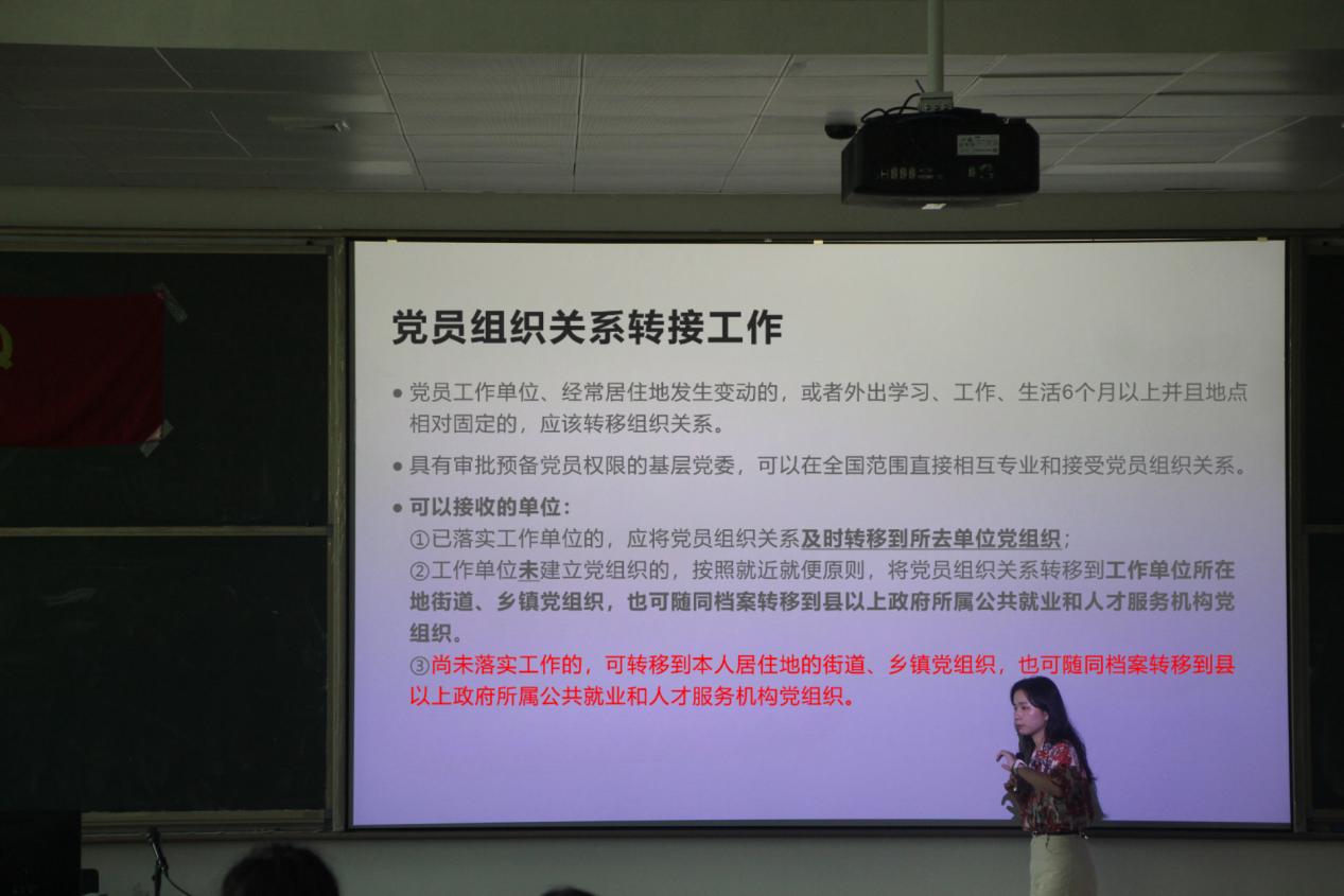 卢倩怡老师通过“党员组织关系管理要求”向各位毕业生党员讲述,党员组织关系对于一位党员的重要性。按照党章的规定,每个党员不论职位高低,都必须编入党的一个支部、小组或其他特定组织,参加党的组织生活,接受党内外群众的监督。让各位毕业生党员明确了党员组织对于党员的重要性。而后对“党员组织关系转接工作”进行了细致的讲解,使毕业生党员们对党员组织关系转接有了更深刻的理解。