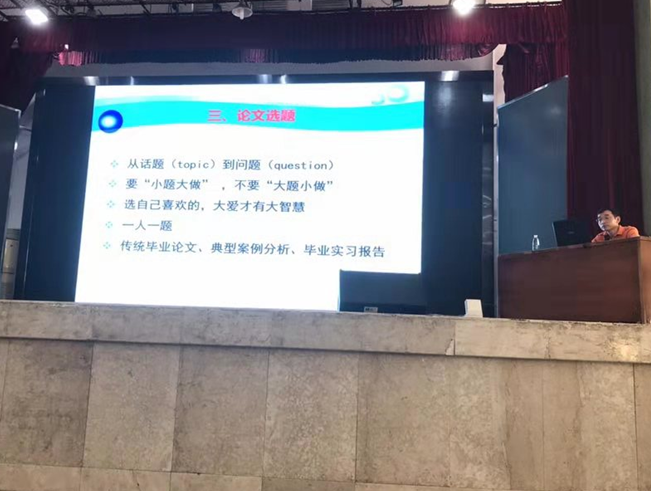 首先,2016级林贤杰同学代表全体毕业生进行了毕业论文写作宣誓。马鹏教授随后做了《2016级本科生毕业论文写作指导》的报告。马鹏教授首先从人才培养环节、学历学位要求、科研能力培养、学习能力提升等方面对公司开展本科生毕业论文工作的必要性和重要性进行了全面的讲解和说明。并依次对文献检索、文献阅读、论文选题、论文开题、论文撰写、论文答辩等写作环节的内容和要求进行了讲解和指导。在此基础上,马鹏教授引用会计名家、中山大学谭劲松教授的语录对毕业论文写作要求进行了总结:“论文”是需要“论”的,撰写毕业论文要有论题、理论、论据、论证、结论等要素。