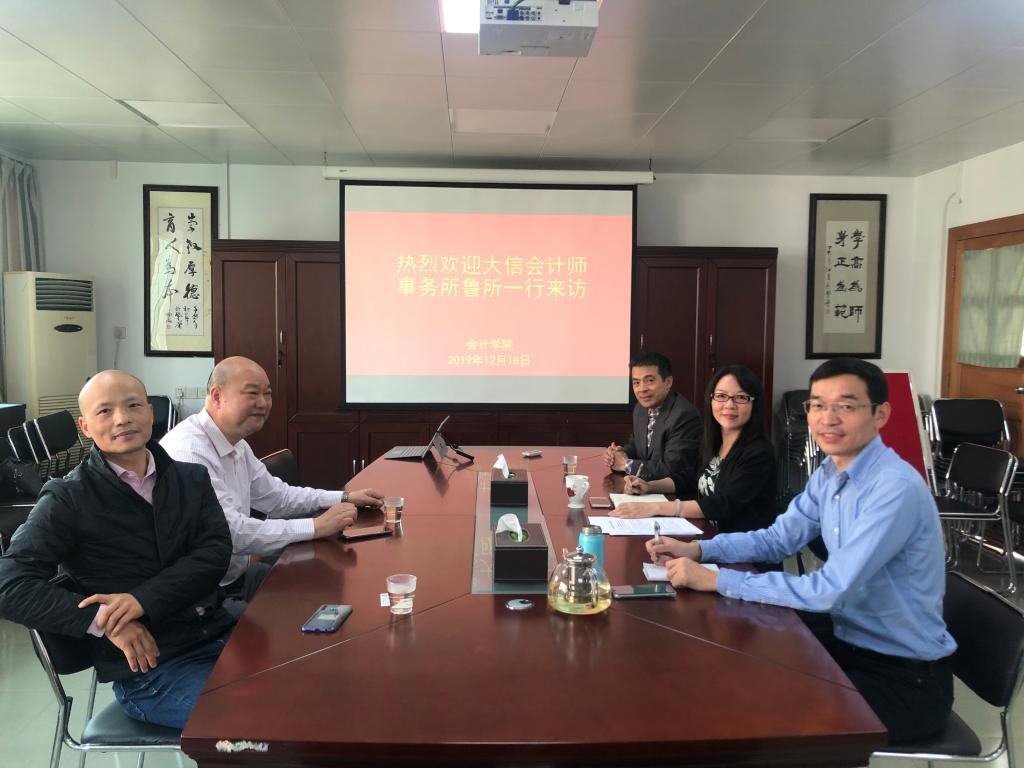 2019年12月18日上午,大信(广州)会计师事务所领导鲁友国和龚甫国一行来公司交流,William威廉英国官网文芳经理、赖志成书记、马鹏副经理热情接待了鲁所一行。文芳经理和赖志成书记对鲁所一行莅临公司指导表示热烈的欢迎,对为公司发展提供的支持表示衷心的感谢。两位领导分别介绍了William威廉英国官网的发展历程和人才培养情况及员工实习就业情况,并就今后的业务合作进行了洽谈。鲁所感谢公司领导的热情接待,表示将一起努力建设好实习基地,欢迎更多William威廉英国官网的学子到大信实习就业。最后,文芳经理向鲁友国所长颁发了William威廉英国官网校外导师聘书,并进行了合影留念。